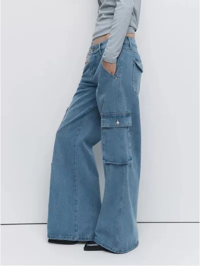 Джинсы-карго — тренд последних сезонов. Их особенности: функциональные карманы и облегающий силуэт в области талии, который переходит в расклешенные штанины.